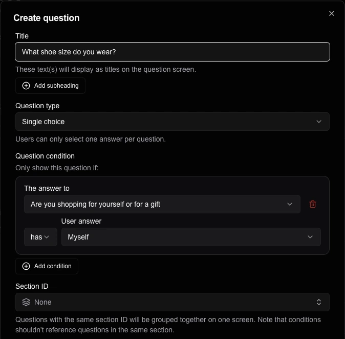 If a question is not required for all users, you can give it a condition. For example, a gift-related question should only be shown if the user previously answered that they are shopping for a gift.